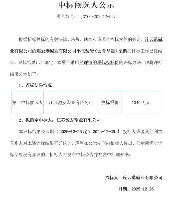 連云港堿業(yè)有限公司的連云港堿業(yè)有限公司小包裝袋(含食品級(jí))采購(gòu)中標(biāo)候選人公示