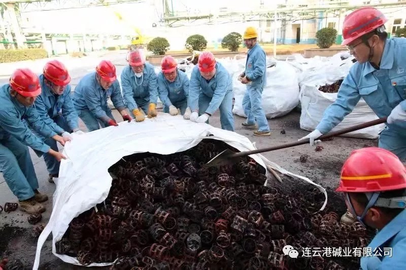 11月7日,重堿車間1#蒸餾塔計(jì)劃?rùn)z修,在檢查過程中發(fā)現(xiàn)鮑爾環(huán)被堿渣堵塞嚴(yán)重,影響正常輪換。11月12日,車間將塔內(nèi)舊填料扒出,足足有75立方。考慮到這些填料清理干凈后還有利用價(jià)值,車間牢固樹立“過緊日子”的思想,打算自行組織職工清理。