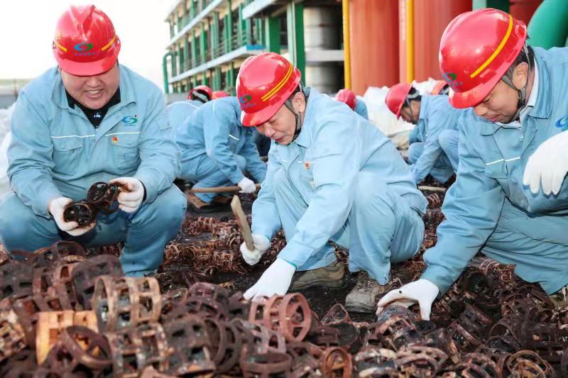 由于清理工作全靠人力完成,崗位人員一邊要維持生產(chǎn),一邊要清理填料,工作量非常大。11月12日下午,公司黨委書記、董事長(zhǎng)張衛(wèi)民在調(diào)研重堿車間生產(chǎn)現(xiàn)場(chǎng)時(shí)了解到這一情況后,當(dāng)機(jī)立斷,立即組織公司領(lǐng)導(dǎo)及各部門黨員干部義務(wù)勞動(dòng),協(xié)助重堿車間完成鮑爾環(huán)填料清理回收工作。