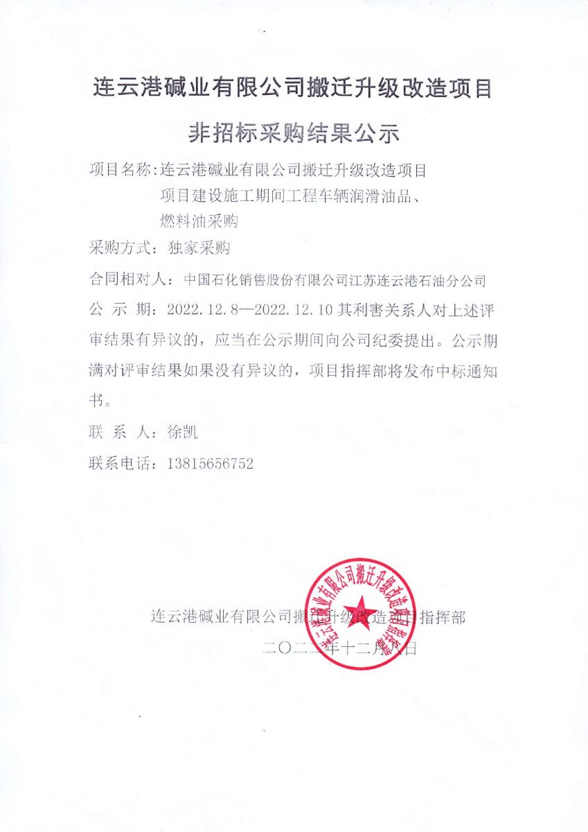 項目建設施工期間工程車輛潤滑油品、燃料油采購非招標采購結果公示