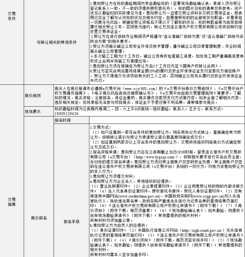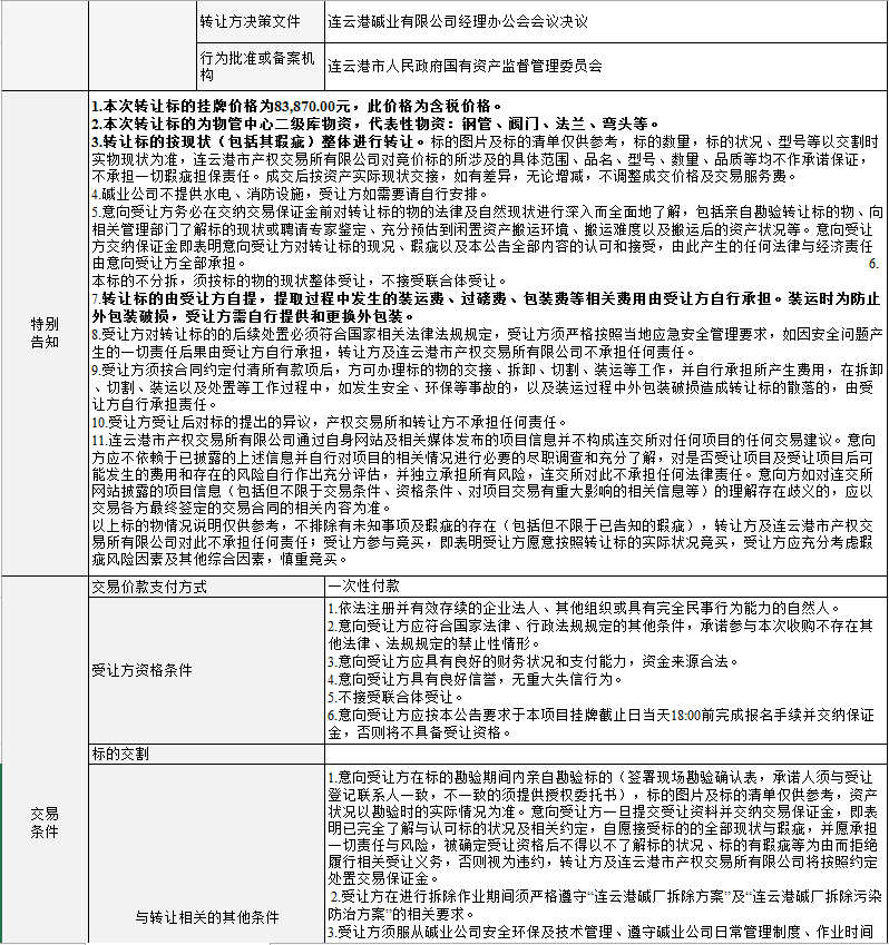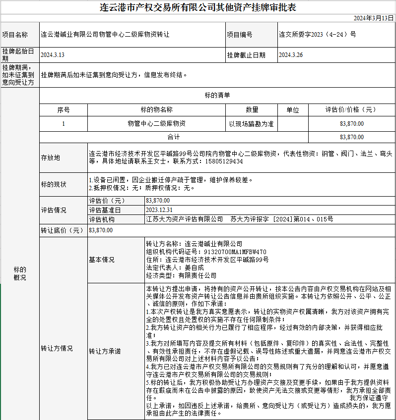 連云港堿業有限公司物管中心二級庫物資轉讓公告