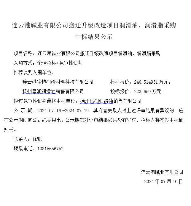 潤滑油、潤滑脂采購中標結果公示