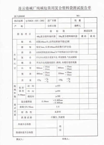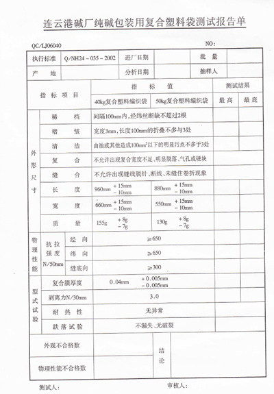 5.6 其他主要資格要求:具有合法有效的生產(chǎn)許可資質(zhì),企業(yè)制度完善、質(zhì)量管理規(guī)范,具有完整的拉絲、織布、縫紉、檢測(cè)等生產(chǎn)線,注冊(cè)資金不少于500萬(wàn)元(人民幣)。食品包裝袋投標(biāo)人應(yīng)具備食用包裝物生產(chǎn)許可資質(zhì),并提供第三方檢測(cè)報(bào)告。投標(biāo)人必須送樣品袋先經(jīng)我公司質(zhì)檢部門檢測(cè)合格(2018年10月20日之前送到連云港堿業(yè)有限公司供應(yīng)部,原招標(biāo)人供應(yīng)商不需送樣品袋)。符合法律、法規(guī)規(guī)定的其他條件。